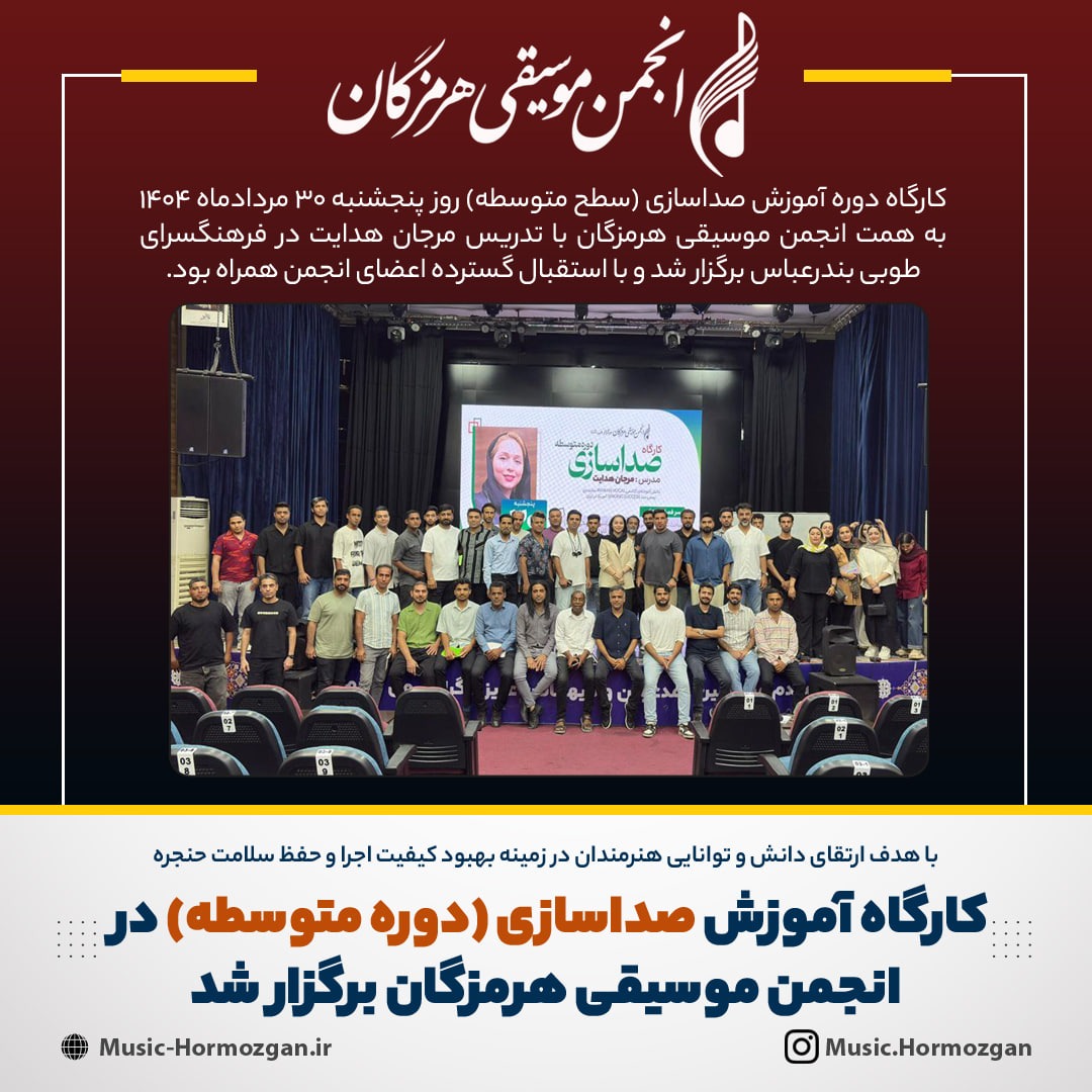 کارگاه دوره آموزش صداسازی (سطح متوسطه) روز پنجشنبه ۳۰ مردادماه ۱۴۰۴ به همت انجمن موسیقی هرمزگان در فرهنگسرای طوبی بندرعباس برگزار شد و با استقبال گسترده اعضای انجمن همراه بود.