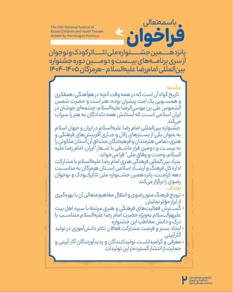 گفتنی است پانزدهمین جشنواره ملی تئاتر کودک و نوجوان و نمایش عروسکی رضوی در نیمه اول اردیبهشت ۱۴۰۵ در استان هرمزگان برگزار خواهد شد.
