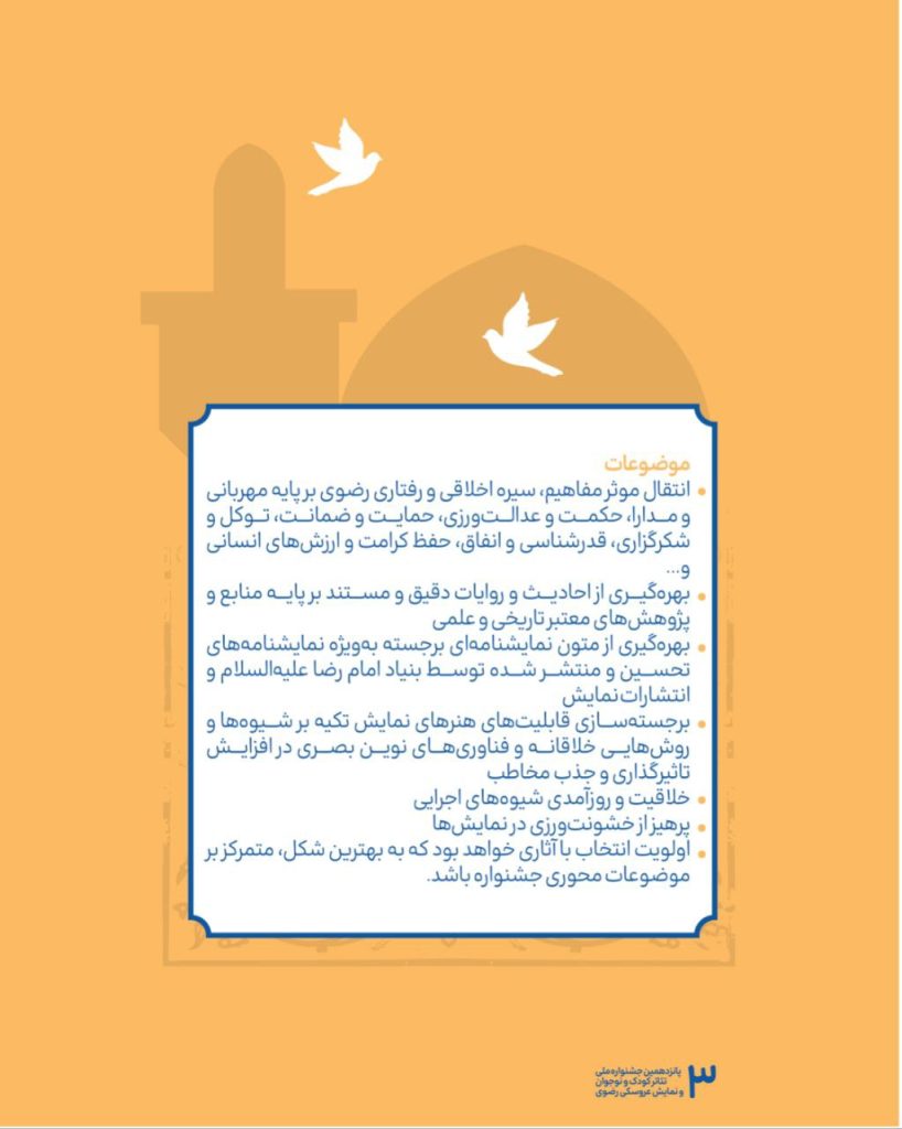 «این جشنواره از برنامههای بیستودومین دوره جشنواره بینالمللی امام رضا(ع) است و با هدف ترویج مفاهیم اخلاقی و رفتاری رضوی، حمایت از تولید آثار فاخر نمایشی و فراهمسازی بستر مشارکت فعال هنرمندان کودک و نوجوان در سطح ملی برگزار میشود.»