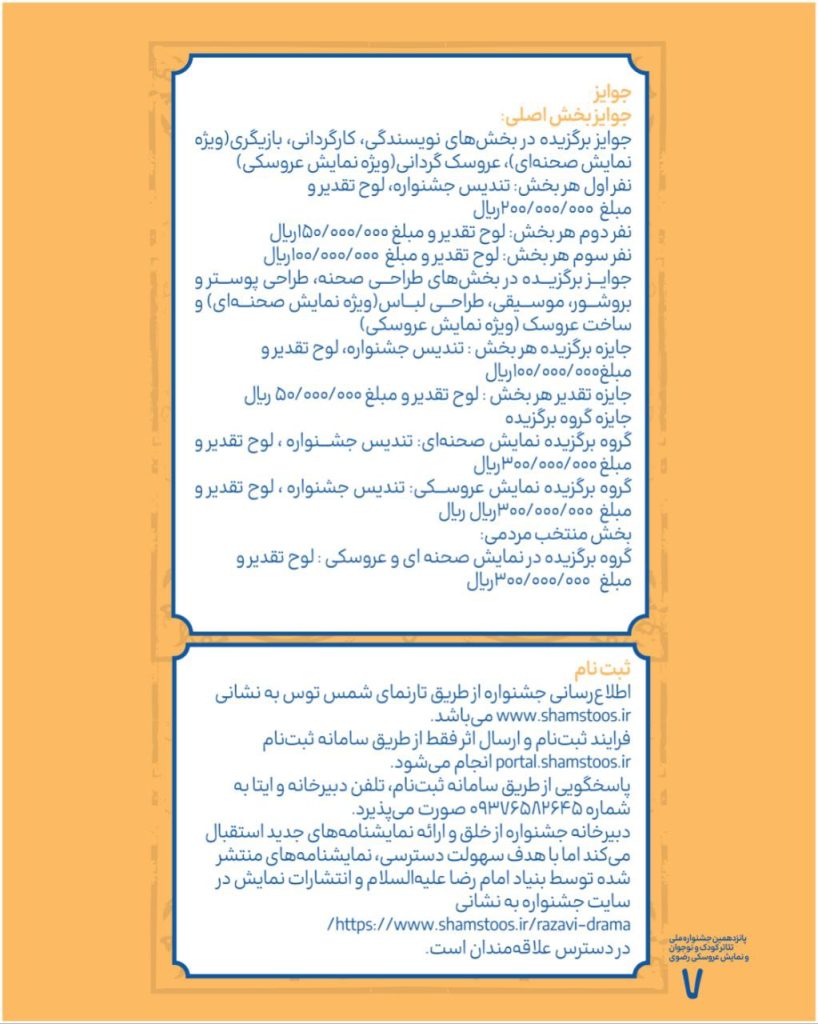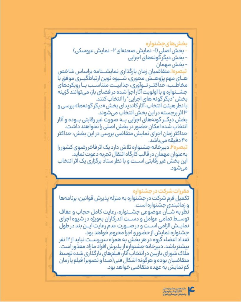 «این دوره شامل بخشهای نمایش صحنهای، نمایش عروسکی، دیگرگونههای اجرایی و بخش مهمان است و هنرمندان میتوانند آثار خود را طبق ضوابط اعلامشده در سامانه شمس توس ثبت و ارسال کنند.»
