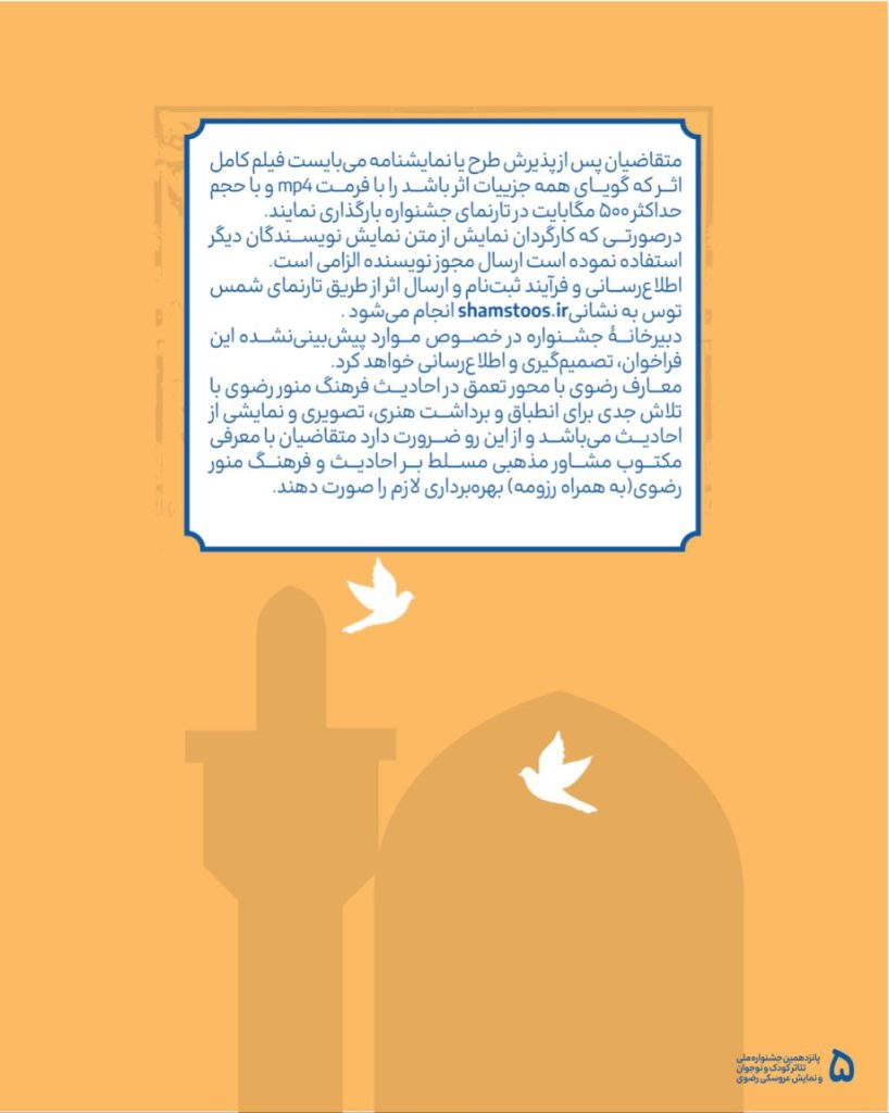 «تمامی مراحل ثبتنام، بارگذاری آثار و پیگیریها از طریق سامانه portal.shamstoos.ir انجام میشود و گروههای پذیرفتهشده موظف خواهند بود فیلم کامل اثر خود را در موعد مقرر بارگذاری کنند.»