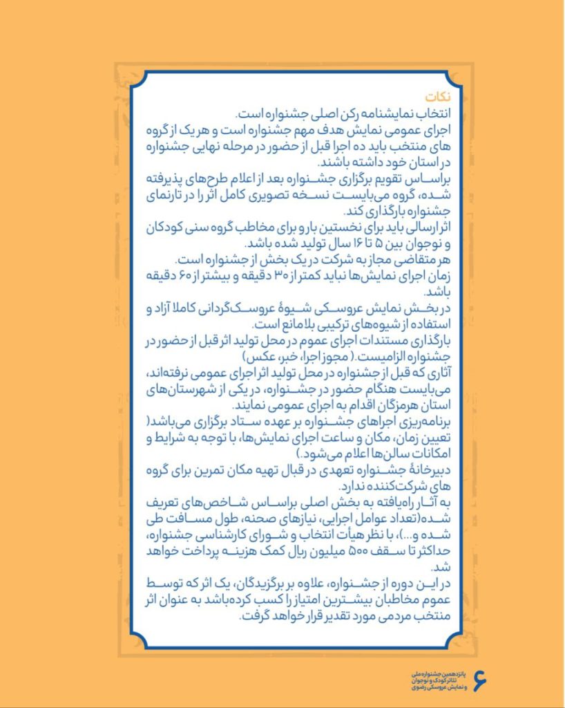 دریافت فراخوان پانزدهمین جشنواره ملی تئاتر کودک و نوجوان و نمایش عروسکی رضوی در هرمزگان