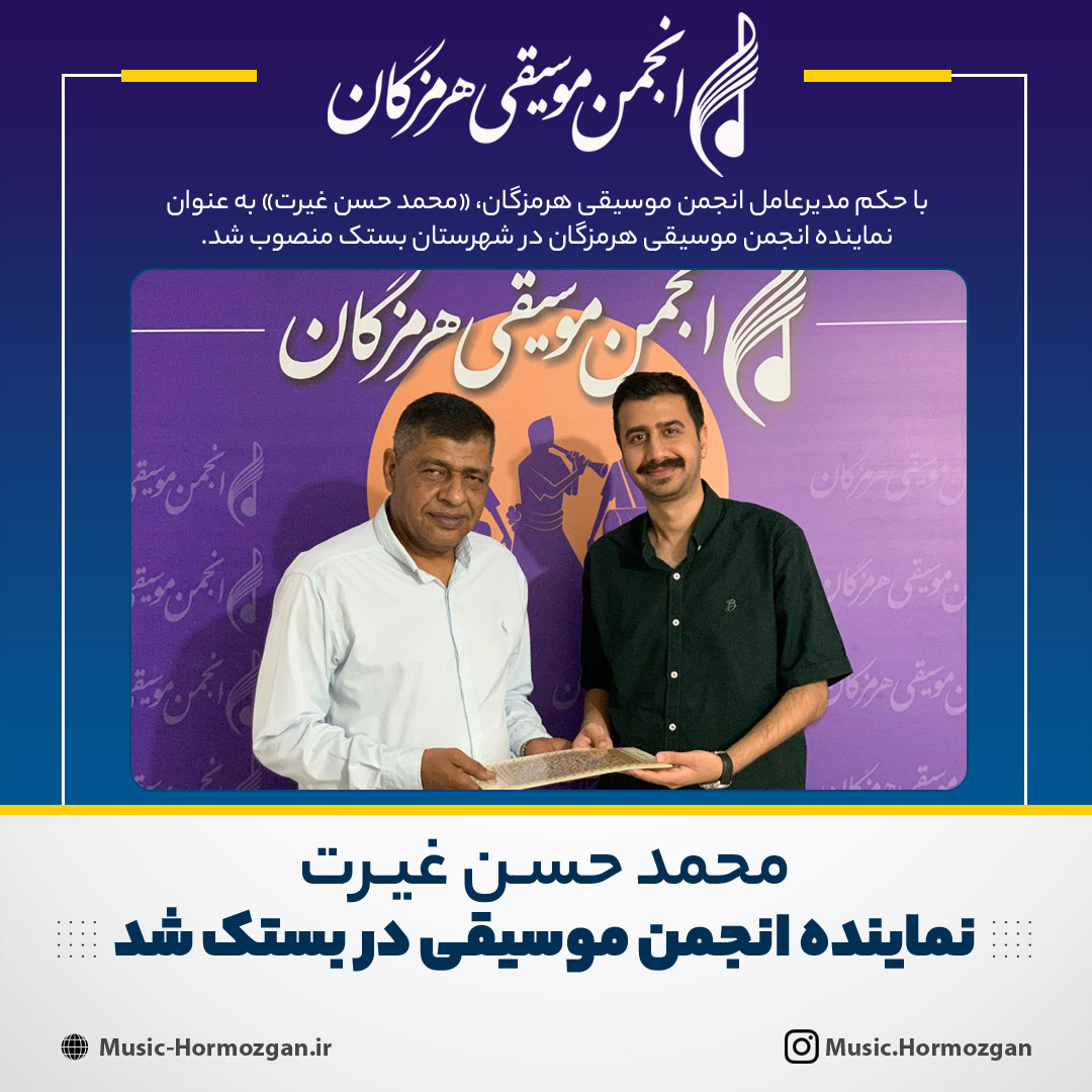 به گزارش شرجی، طی حکمی از سوی احمد معلمزادگان، مدیرعامل انجمن موسیقی هرمزگان، جناب آقای محمدحسن غیرت ازپیشکسوتان عرصه موسیقی شهرستان بستک به عنوان نماینده رسمی انجمن موسیقی هرمزگان در شهرستان بستک منصوب شد.