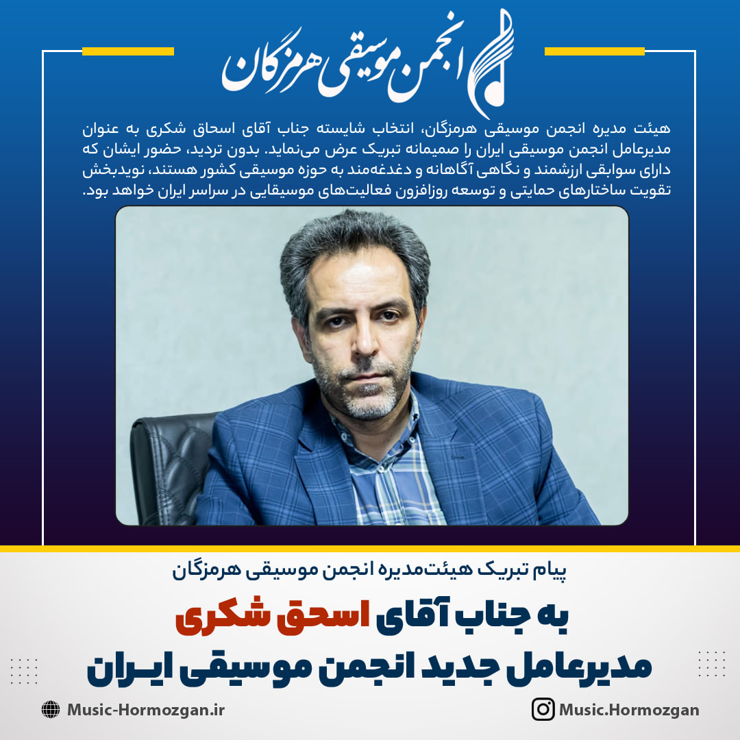 «هیئت مدیره انجمن موسیقی هرمزگان، انتخاب شایسته جناب آقای اسحاق شکری به عنوان مدیرعامل انجمن موسیقی ایران را صمیمانه تبریک عرض مینماید. بدون تردید، حضور ایشان که دارای سوابقی ارزشمند و نگاهی آگاهانه و دغدغهمند به حوزه موسیقی کشور هستند، نویدبخش تقویت ساختارهای حمایتی و توسعه روزافزون فعالیتهای موسیقایی در سراسر ایران خواهد بود.»