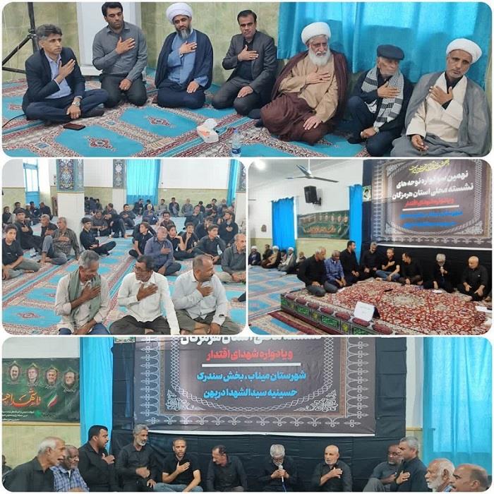 نهمین دوره سوگواره نوحههای نشسته استانی هرمزگان با حضور آیت الله ابراهیمی امام جمعه شهرستان میناب، مصطفی کریمی رئیس اداره فرهنگ و ارشاد اسلامی حجت الاسلام سهرابی رئیس اداره تبلیغات اسلامی شهرستان میناب به میزبانی حسینیه سیدالشهدا دهستان درپهن بخش سندرک برگزار شد.
